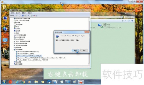 4、 进入控制面板的设备管理器,找到网络适配器中的Microsoft Virtual WiFi Miniport Adapter,右键选择卸载即可将其移除。但该设备在电脑重启后会自动重新生成,无法彻底消除。