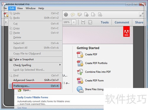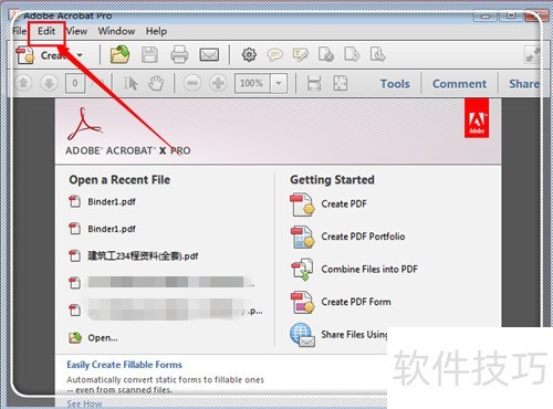 1、 打开Adobe Reader后,点击顶部菜单中的编辑选项。本文以英文版为例,若使用简体中文版,可参照对应的中文菜单名称,按步骤操作即可完成相应设置。
