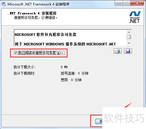 6、 安装准备就绪后,系统将弹出 .NET Framework 4 的安装界面。请勾选我已阅读并接受许可条款,然后点击右下角的安装按钮,即可启动程序安装流程。