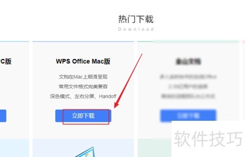 5、 进入WPS官网,在热门下载区域找到WPS Office Mac版,点击立即下载按钮即可开始下载安装程序。