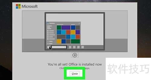 8、 提示出现后点击关闭,Microsoft Office程序即完成安装,您可立即在电脑上正常使用各项功能。