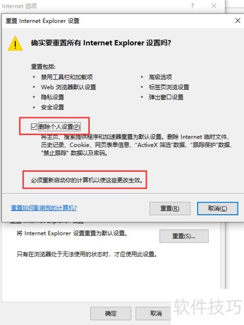 4、 选择删除个人设置,系统提示需重启计算机以生效,确认后点击重置按钮,操作所示。