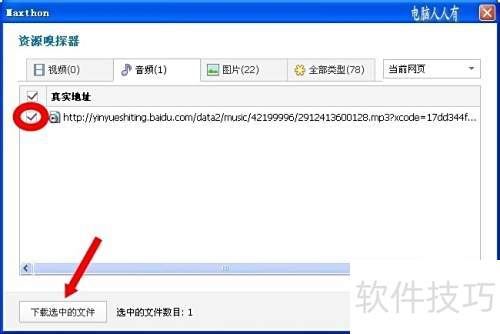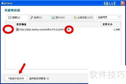3、 下载视频时,先打开网页视频并等待缓存完成,接着启动资源嗅探器,确认视频格式并勾选对应项目,最后点击下载所选文件即可。