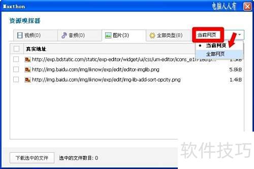 2、 下载网络资源需在当前页面操作,浏览器右上角的▼图标可打开自定义快捷工具栏,使用资源嗅探功能。