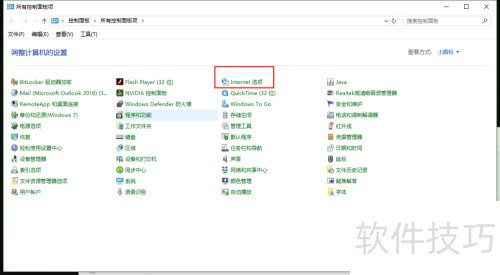 3、 所示,进入控制面板找到Internet选项