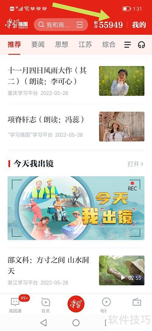 1、 打开学习强国应用,点击右上角积分区域即可查看。