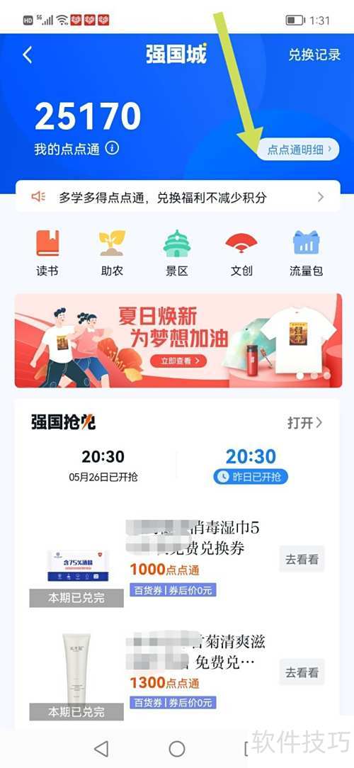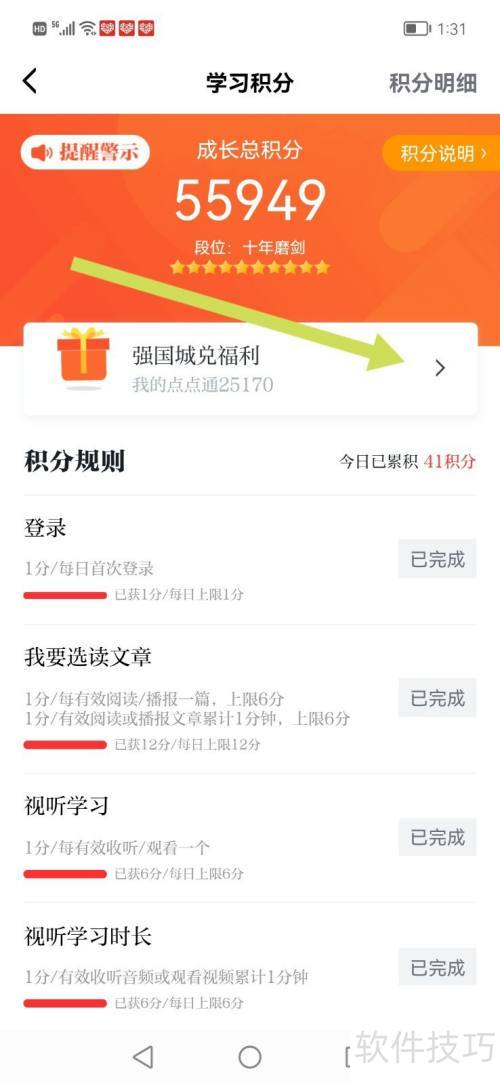 14、 首页右上角积分进入强国城兑换福利,点击后查看点点通明细。