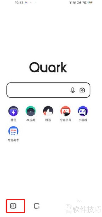 1、 打开夸克浏览器,点击左下角书籍图标。