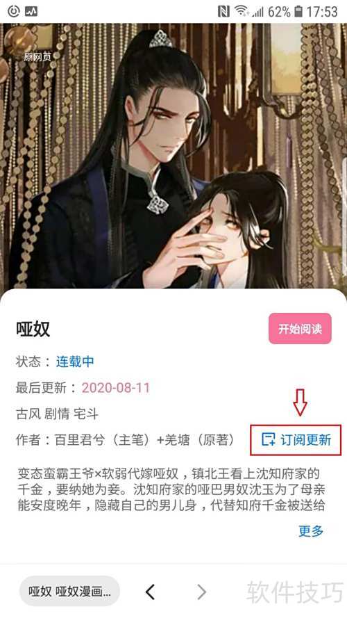 2、 看到喜爱的漫画时,其封面首页设有订阅按钮,位置所示。