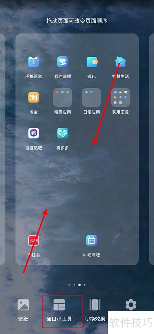 1、 双指在桌面捏合进入编辑,点击窗口小工具。