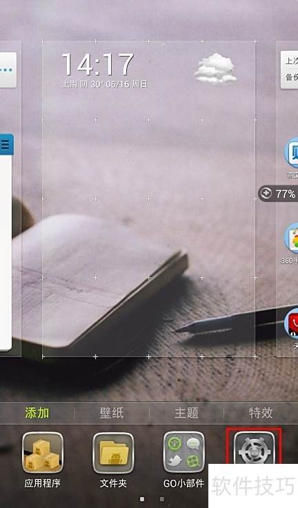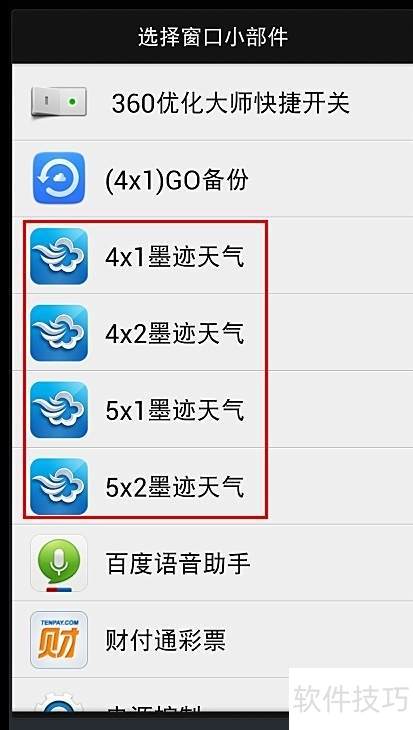 2、 以Go桌面为例,长按主屏幕,进入系统小部件菜单,挑选墨迹天气相应尺寸的插件,确认后即可将其添加到桌面上显示。