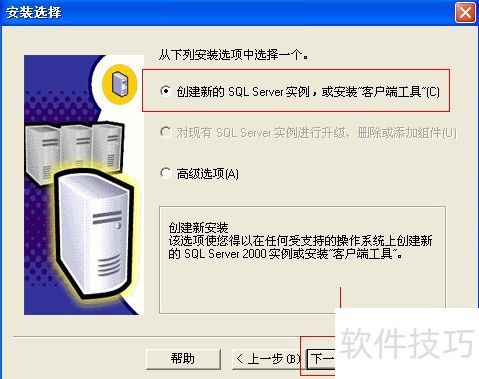 6、 在安装选择对话框中,选择创建新的SQL Server实例或安装客户端工具(高级选项通常用于数据库修复或重置,后续步骤一致),然后点击下一步。