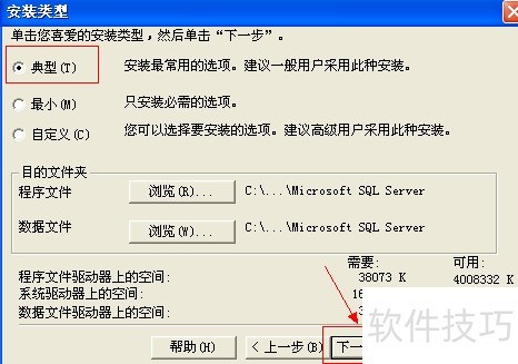 9、 选择典型安装模式即可,随后设置程序与数据文件的安装路径。系统默认路径为C:Program FilesMicrosoft SQL Server,但建议将软件安装在非系统盘,例如D盘的D:Program FilesMicrosoft SQL Server目录中,以提升系统稳定性和数据安全性。设置完成后,点击继续安装流程,确保安装过程顺利进行。