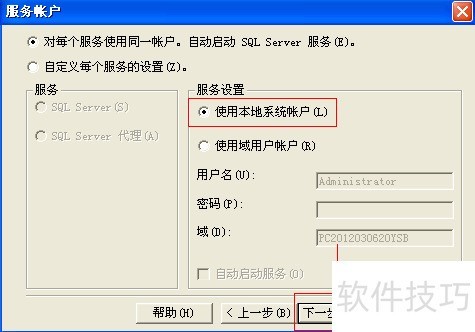 10、 选择为每个服务使用相同账户:自动启动SQL Server服务,并指定使用本地系统账户,随后点击下一步继续操作。