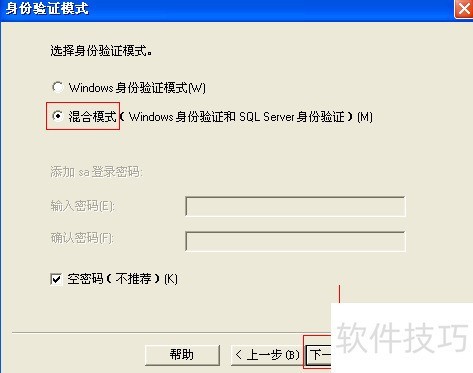 11、 选择混合模式(Windows身份验证与SQL Server身份验证),设置管理员sa账户的密码,通常设为空密码以便于登录,然后点击下一步继续操作。