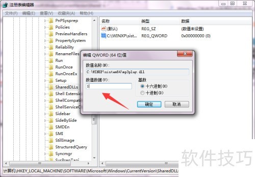 5、 将数值设为1,点击确定保存并关闭注册表。