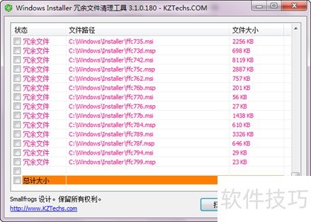 3、 扫描过程仅需1至2分钟即可完成,完成后将显示冗余文件列表,并在列表底部展示所有冗余文件的总大小。用户可通过点击左侧复选框选择需要清理的文件,随后点击删除所选文件逐一清除。若需批量删除全部冗余文件,请参阅第4部分操作说明。