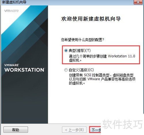 2、 打开新建虚拟机向导,选择典型配置,点击下一步继续安装设置。