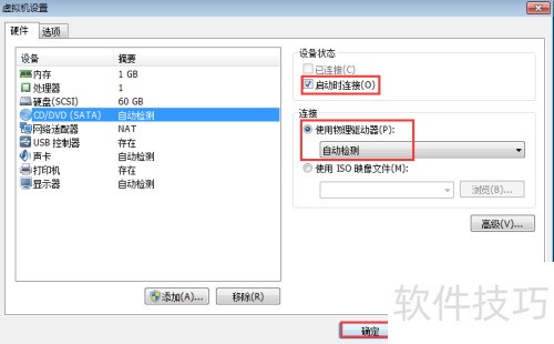 9、 打开虚拟机设置对话框,在左侧设备列表中选中CD/DVD(SATA),勾选右侧的启动时连接,然后在连接区域选择光驱连接方式,最后点击确定完成设置。
