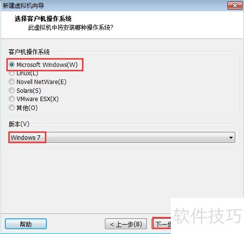 4、 进入选择客户机操作系统界面后,选择操作系统类型为Microsoft Windows,并在版本选项中选中所需系统,例如Windows 7,确认无误后点击下一步按钮继续安装流程。