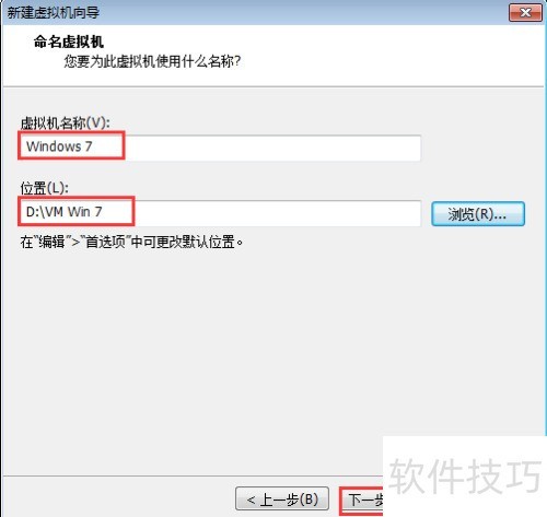 5、 在命名虚拟机界面中,将虚拟机名称保留为Windows 7,点击浏览按钮,于弹出窗口中选择预先规划好的D盘文件夹VM Win7作为存储路径,即工作目录,设置完成后,点击下一步继续操作。