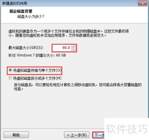 6、 在指定磁盘容量界面中,将最大磁盘大小设为60GB,勾选将虚拟磁盘存储为单个文件(O),随后点击下一步继续操作。