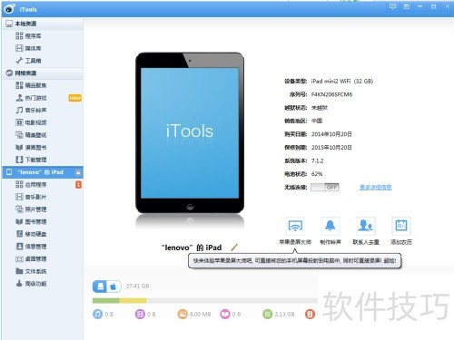 2、 在电脑上安装iTools软件后,将iPad连接至电脑,iTools会自动识别并显示已连接的iPad设备,方便进行数据管理与传输操作。