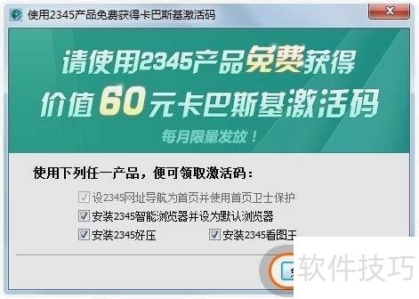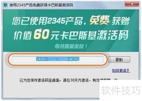 2、 安装2345产品时,卡巴斯基会同步安装,完成后将弹出激活码,请及时复制保存。