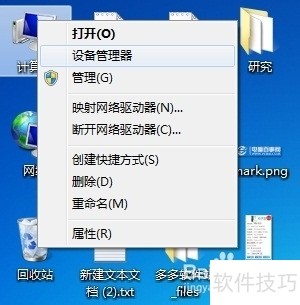 2、 在桌面计算机图标上右击,选择设备管理器,操作所示。