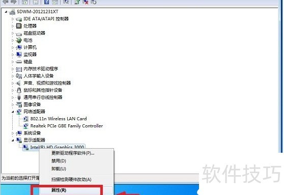 4、 打开设备管理器,展开显示适配器选项,找到显卡名称,右键点击该名称,随后选择属性进行查看和设置。