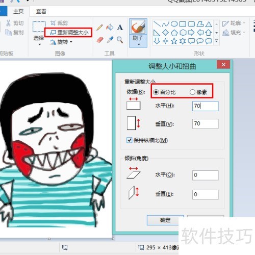 21、 选择重新调整大小功能,可按比例或像素调整图片。例如输入70%后保存,文件体积会缩小,重复操作直至满足所需大小。