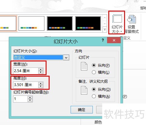 24、 将PPT页面尺寸设为2.54×3.501厘米,此为软件允许的最小值,与标准一寸照片尺寸基本一致,误差极小,可忽略不计,不影响实际使用效果。