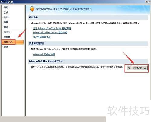 2、 在Excel中,进入信任中心,再于右侧窗口点击信任中心设置进行配置。