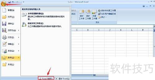 1、 打开Excel文件,点击左上角圆形图标,进入后选择Excel选项进行设置。