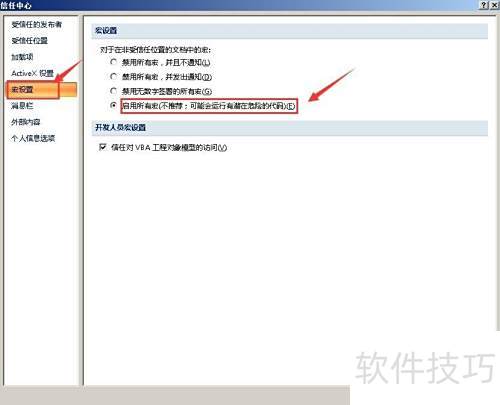 3、 在信任中心选择宏设置,启用所有宏后确认即可。