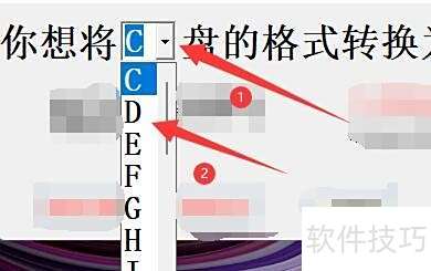 2、 在弹出窗口中,点击选择按钮,从下拉菜单中选取要转换的盘符,例如选择D盘。