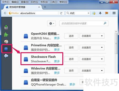 3、 在附加组件界面,先于左侧选择插件选项,再在右侧查找Shockwave Flash,此即为Flash插件。