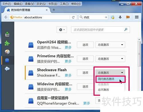 2、 若更新后仍频繁出现死机现象,建议调整相关设置。由于Flash默认处于始终启用状态,一旦启动火狐浏览器便会自动加载,而Flash运行时会大量占用系统资源,容易导致浏览器开启时系统卡死。为避免此问题,可将Flash设置为点击激活模式。操作方法如下:启动火狐浏览器后,点击右上角的三条横线菜单按钮,进入主菜单界面,随后选择附加组件选项,接着在插件管理页面中找到Flash相关设置,将其更改为询问或点击激活状态,从而减少资源占用,提升浏览器运行稳定性。
