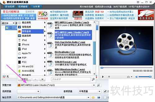 4、 将F4V文件导入后,接下来需选择转换为MP3格式。在转换器主界面底部,点击预置方案旁的下拉菜单,从弹出的选项中找到常用音频格式,选择MP3即可。此功能同样支持将FLV等其他格式一并转换为MP3,操作简便,适用多种音频转换需求。