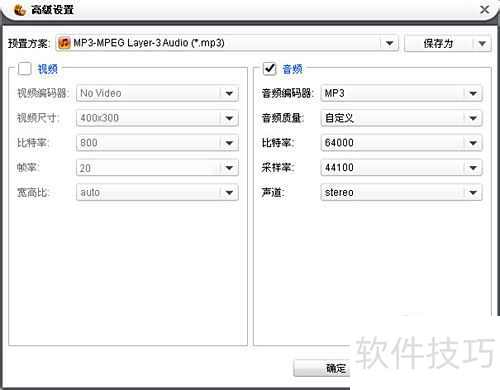 5、 选择MP3格式后,进入文件参数配置。点击菜单栏旁的高级设置,即可进入相关设置界面,具体操作所示。