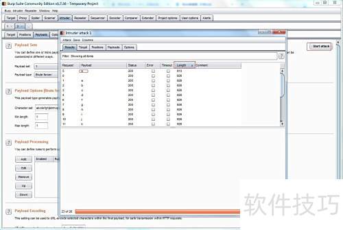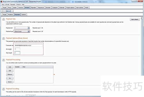 7、 选择payload类型为brute forcer,仅使用26个英文字母进行暴力猜解。将数据名称设为字母,清除字符集中的数字内容,并将最小和最大长度均设置为1,确保每次仅生成单个字母的测试载荷,用于针对性的枚举测试。
