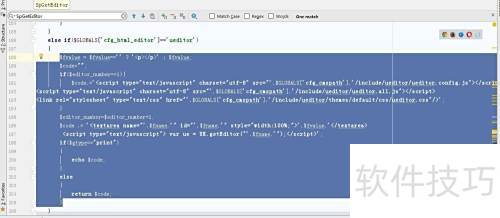 5、 此时会注意到已有两款编辑器通过 if 和 else if 的方式实现调用代码的切换。若需新增一款名为 ueditor 的编辑器,只需添加一条 else if(\$GLOBALS==ueditor) { ... } 判断语句,并在对应的大括号内填入相应代码即可完成扩展,结构清晰且便于维护,不影响原有功能,确保各编辑器之间的切换逻辑顺畅。