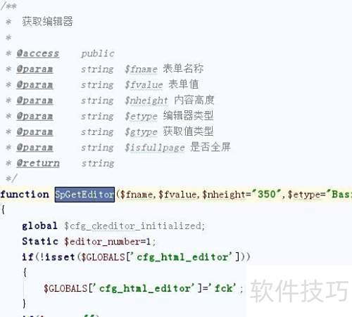 4、 找到函数 SpGetEditor,该函数用于获取编辑器。在其内部,位于代码行 global \$cfg_ckeditor_initialized; 的下方,添加一个静态变量:static \$editor_number = 1; 这样可确保变量在函数多次调用时保持其值,便于后续逻辑处理。