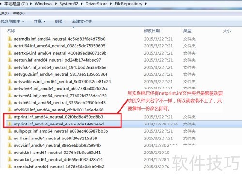 7、 例如,若日志中出现Unable to load INF: C:WindowsSystem32DriverStoreFileRepository tprint.inf_amd64_neutral_02f0bd8e459ed8b3 tprint.inf(00000003)的提示,表明系统在尝试加载指定路径下的ntprint.inf文件时失败。此时应顺着该路径查找,确认该文件夹是否存在以及文件是否完整。实际检查中可能发现,系统中已存在类似名称的文件夹,如ntprint.inf_amd64_neutral_4616c3de1949be6d,但其命名与驱动安装程序所要求的不一致,导致无法识别,从而引发安装失败。