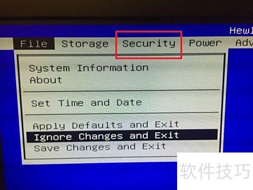 2、 进入BIOS主界面后,选择后续的Security选项。