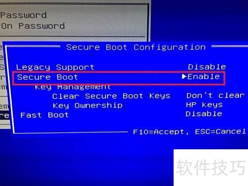 5、 进入安全启动配置界面后,可看到安全启动选项,其后的启用表示开启功能,通过键盘左右方向键可切换该选项的开关状态,操作简便直观,按需选择即可完成设置。
