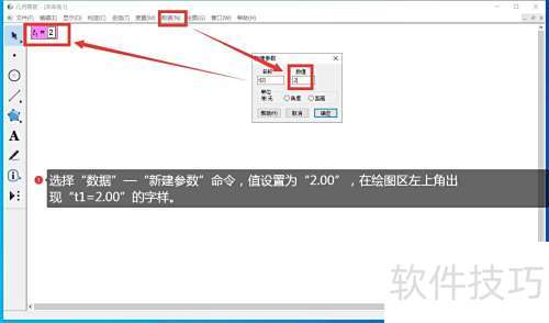 1、 启动软件后,点击顶部菜单数据中的新建参数,将数值设为2.00,绘图区域左上角随即显示t1=2.00。