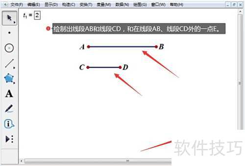 2、 画出线段AB与CD,并取一点E位于两线段之外。