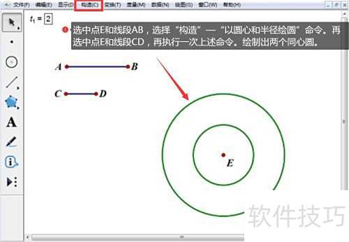 3、 选取点E与线段AB,执行以圆心和半径绘圆操作;再选取点E与线段CD,重复该操作,即可画出两个共用圆心的圆。
