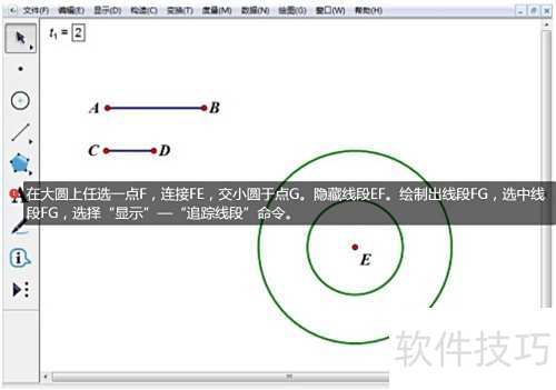 4、 在大圆上任取一点F,连接FE并交小圆于G,隐藏EF。绘制FG线段,选中后通过显示菜单选择追踪线段功能。
